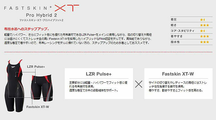 スピードの競泳水着!! ●軽量でハイパワー、さらにフィット感にも優れた布帛素材であるLZR Pulse+をメインに使用し、同時に脇の切り替えや肩紐には透けにくくてストレッチ性の高いFastskin XT-Wを採用したハイブリッドモデル! ●暗くなりやすいレーシングモデルに対してアクセントとなる明るめのカラーをあしらっています。