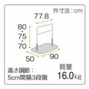 ●サイズ/幅90×奥行50×高さ70・75・80cm、手すり部:幅77.8cm ●重さ/16kg ●材質/手すり:プラスチック被覆パイプ、手すりジョイント:プラスチック、ベース:スチール、フチ部:ゴム ●耐荷重/60kg ・ひざ・腰に負担を掛けない立ち上がり動作のお手伝い。